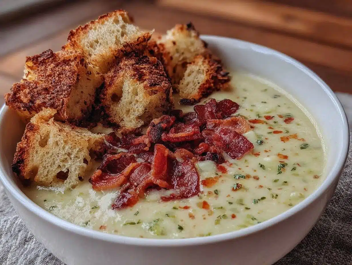 A comforting and creamy potato leek soup topped with crispy bacon and buttery soda bread croutons, perfect for cozy dinners and easy weeknight meals.