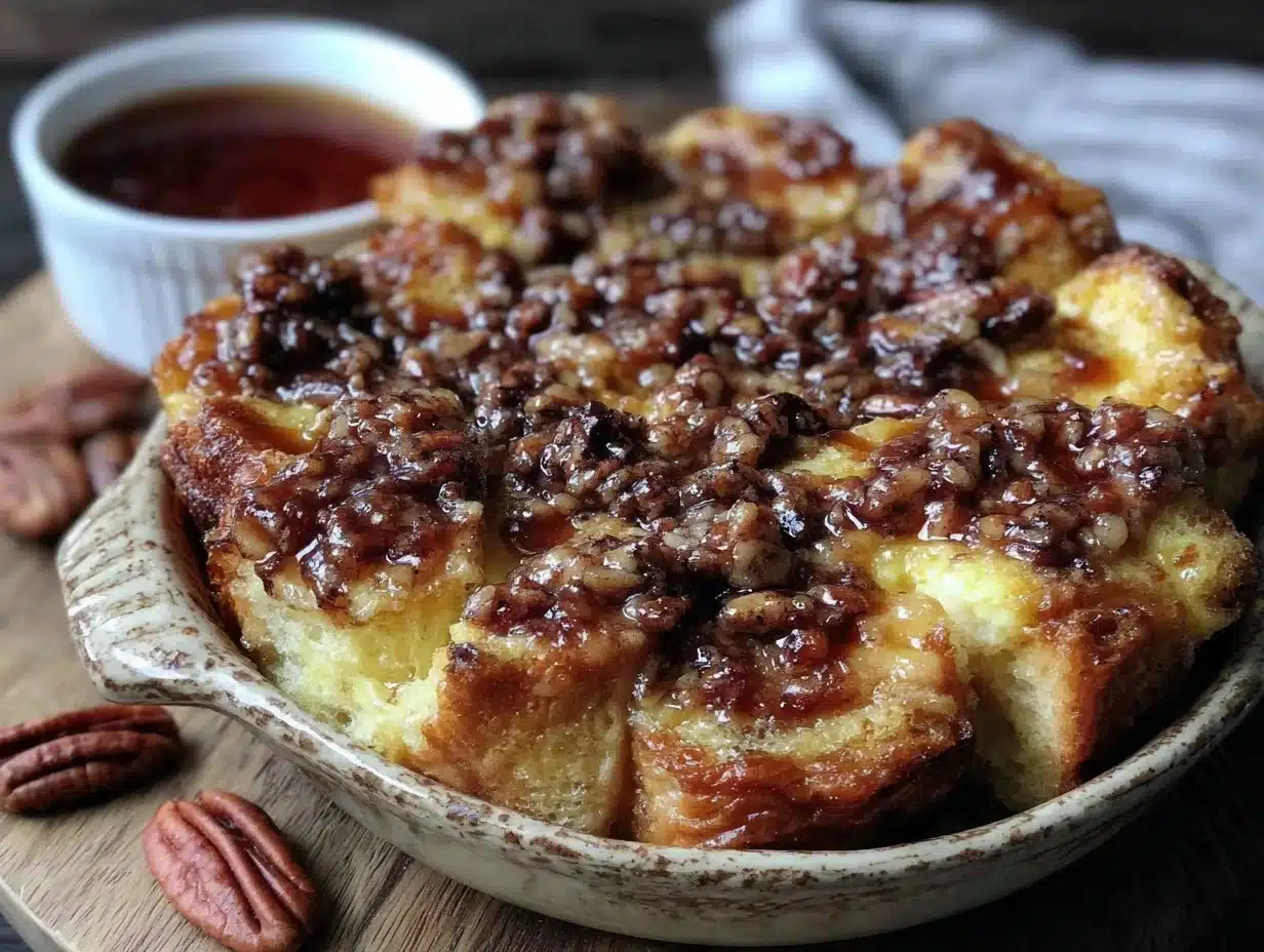 A comforting and easy make-ahead French toast casserole soaked overnight and topped with a crunchy praline topping, perfect for busy mornings or entertaining.